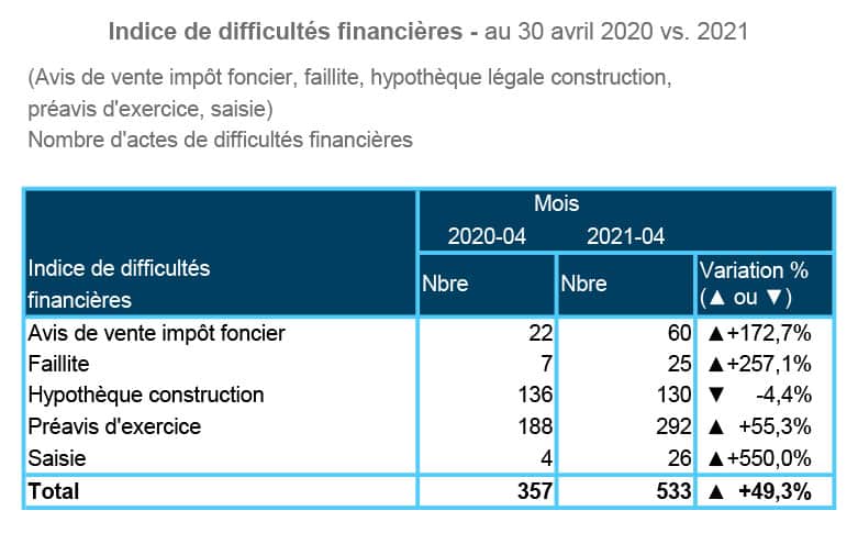 L’indice de difficultés financières * regroupe certains actes qui dénotent une difficulté pour un propriétaire à respecter ses obligations financières. Il peut s’agir d’un défaut de paiement sur une hypothèque ou sur un impôt foncier, une faillite ou une saisie. Le préavis d’exercice fait également partie de cette catégorie. Il survient lorsqu’une personne est en défaut de paiement. Son institution financière, par exemple, peut alors entamer des recours.